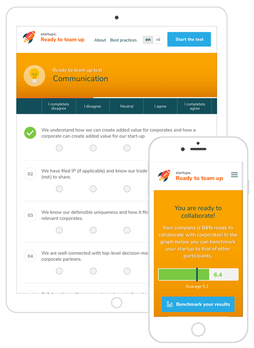 Wij ontwikkelden het Ready To Team Up platform waar startups en bedrijven aan het onderzoek kunnen meedoen, eigen resultaten vergelijken met soortgelijke organisaties en inzicht krijgen over hoe samenwerking verbeterd kan worden.
