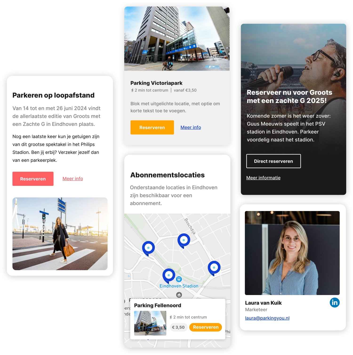 Om content als campagnes, events en nieuws beter af te stemmen op parkeerders, bouwden we een blokkendoos vol blokken om elke gewenste pagina op te bouwen: van content, banners, inschrijfformulieren en kaartjes tot uitgelichte events, producten en nieuws.