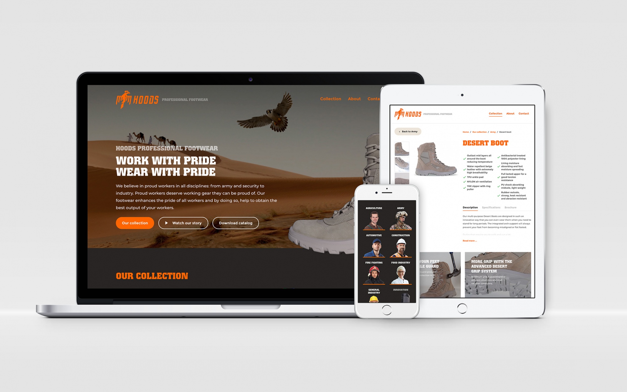 Vanuit Emma Safety Footwear kregen we de vraag om een brand te bouwen rondom een nieuw te ontwikkelen veiligheidsschoen die geproduceerd zou worden in een high tech fabriek in Abu Dhabi. Emma werkte hiervoor samen met de National Factory for Safety and Security Products (NFSSP). Het doel was om de twee partijen de HOODS boot in gezamenlijkheid te helpen verkopen aan het leger in UAE. Aan ons het verzoek om een treffende brandpresentatie neer te zetten.