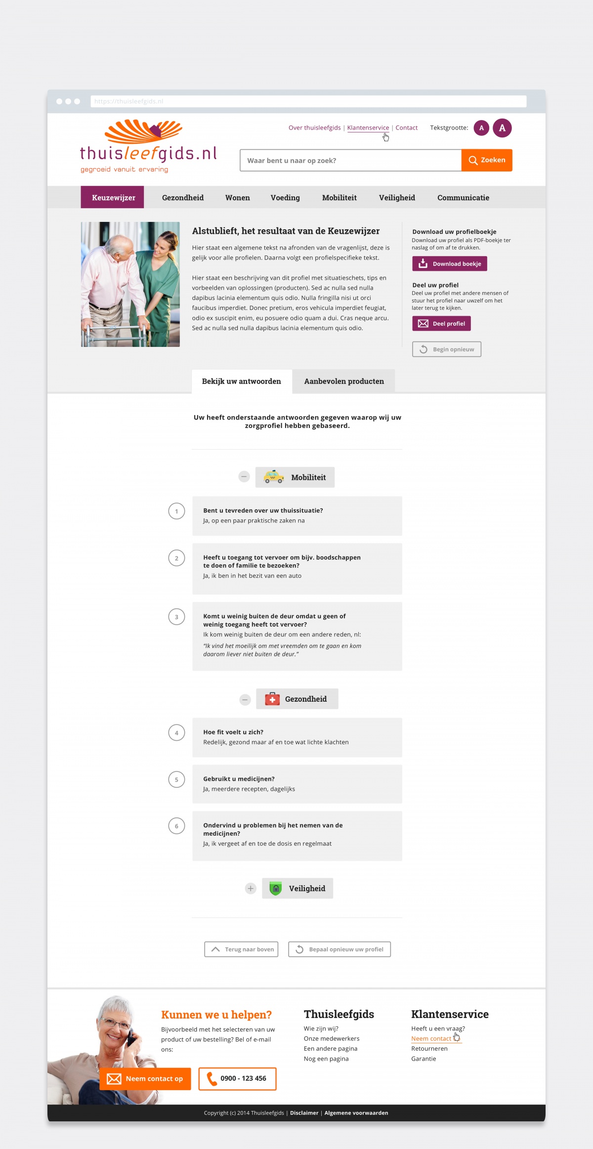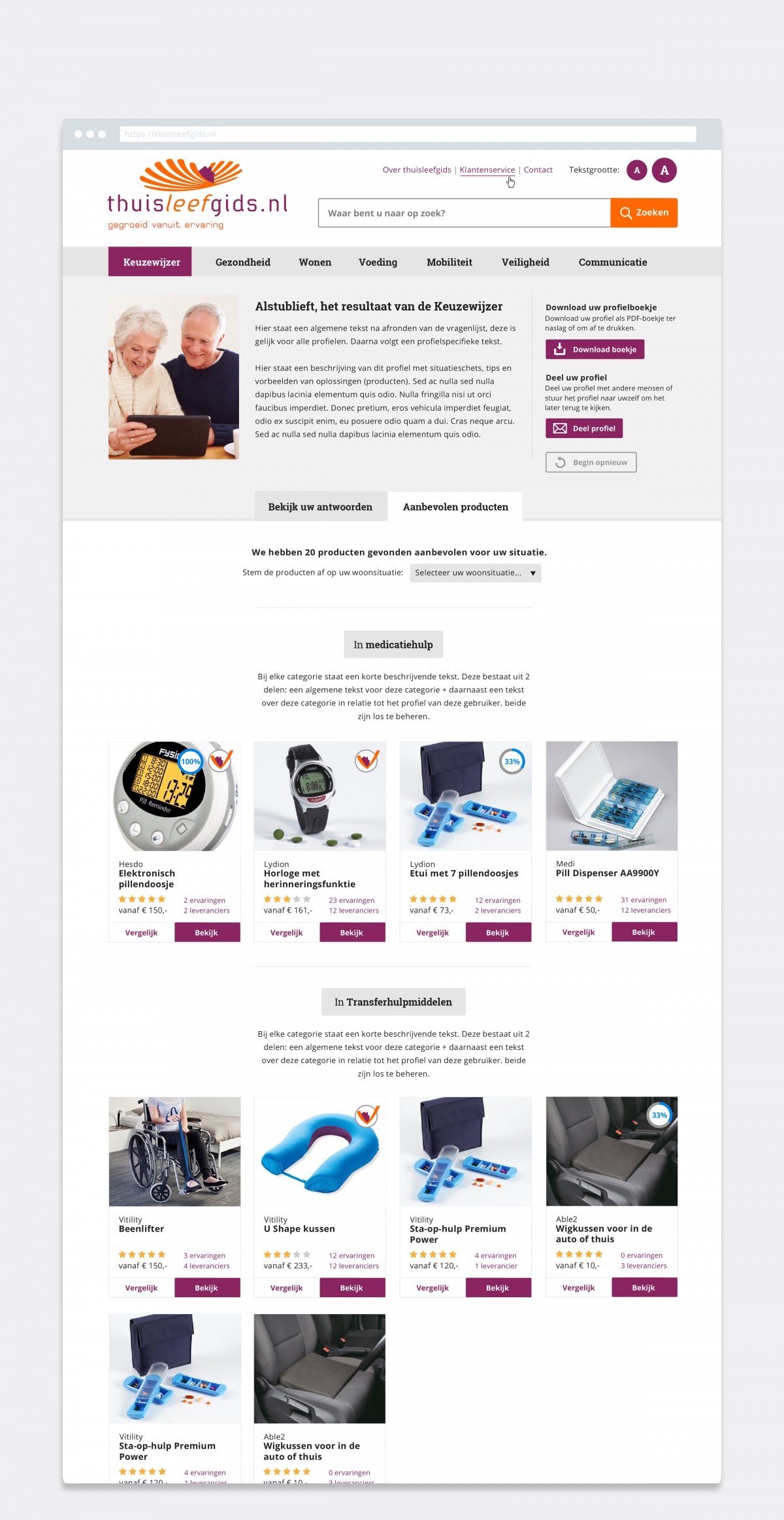 Het resultaat Thuisleefgids.nl is een online platform waar bezoekers eenvoudig producten kunnen vergelijken, bestellen en ervaringen uitwisselen. De website beschikt over een keuzewijzer, waarbij de gebruiker op toegankelijke wijze wordt geholpen bij de keuze voor het juiste product. Daarnaast biedt het platform de mogelijkheid tot het maken van een white label variant, waarbij een zorgaanbieder geheel in de eigen look-and-feel gebruik kan maken van alle faciliteiten op de Thuisleefgids website.
